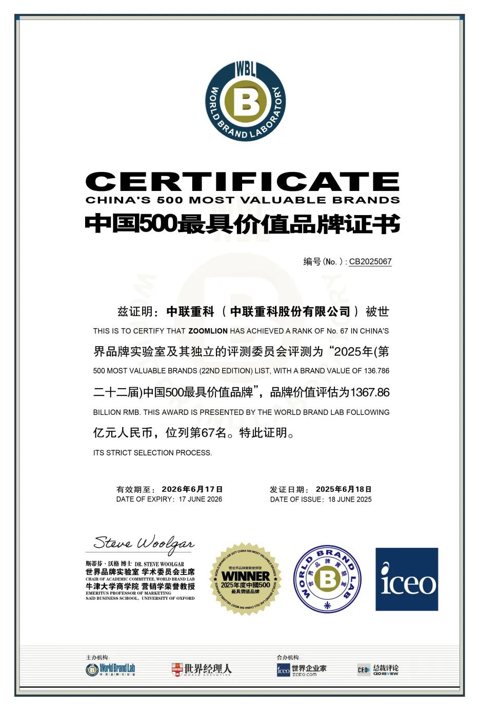 6月18日,由世界品牌實(shí)驗(yàn)室(World Brand Lab)主辦的第22屆世界品牌大會(huì)在北京舉行,會(huì)上發(fā)布了2025年《中國500最具價(jià)值品牌》分析報(bào)告,中聯(lián)重科以1367.86億元品牌價(jià)值登榜,在去年基礎(chǔ)上再次提升111.15億元,穩(wěn)健高質(zhì)量發(fā)展成效顯著。