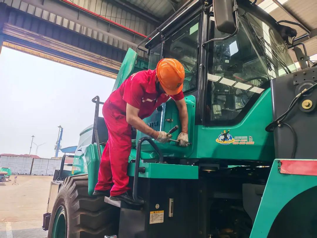 作為此次客戶關愛行活動的重要一站,山推服務團隊頂著盛夏酷暑,率先奔赴山東區域某港口,為客戶的6臺LE60-X5電裝整機提供全方位檢修服務。抵達現場后,服務人員迅速投入工作。針對港口作業環境的特點,團隊制定了精細化服務方案:首先對6臺整機開展全車點檢,重點檢查核心組件的運行狀態,細致排查螺栓緊固度,確保設備關鍵部位無隱患。